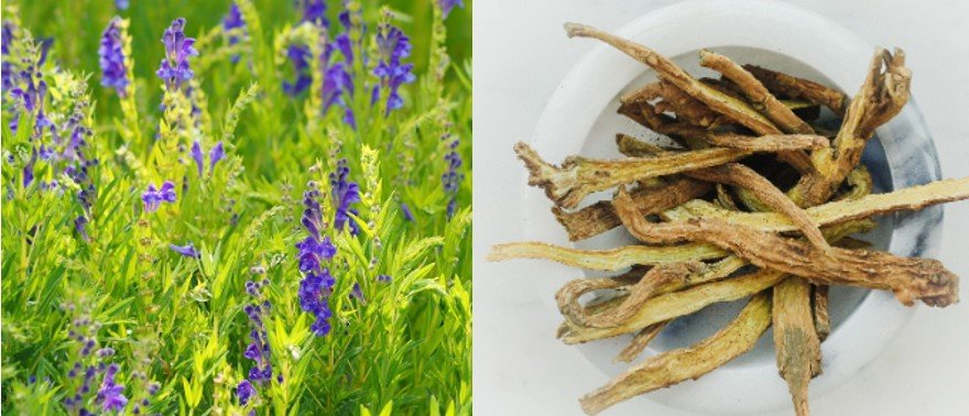 - Baical Skullcap yang mengandung flavonoid, terdiri dari baicalin, baicalein, flavone synthases, chrysin, oroxylin, skullcapflavone, apigenin, salvigenin, scutellarein, isoscutellarein, wogonin, dan wogonoside. Kandungan ini menstimulasi hingga ke akar dan meningkatkan mikrosirkulasi di kulit kepala. Meningkatnya mikrosirkulasi ini meningkatkan kesehatan kulit kepala bahkan hingga jaringan dalam ke folikel dan akar, rambut pun tumbuh tebal dan kuat.