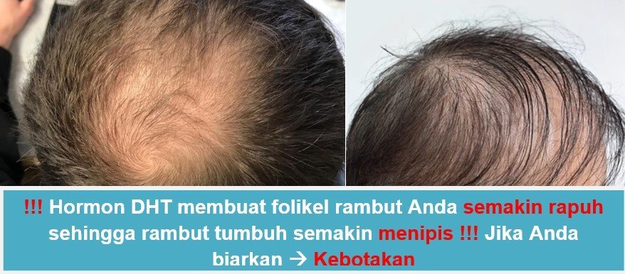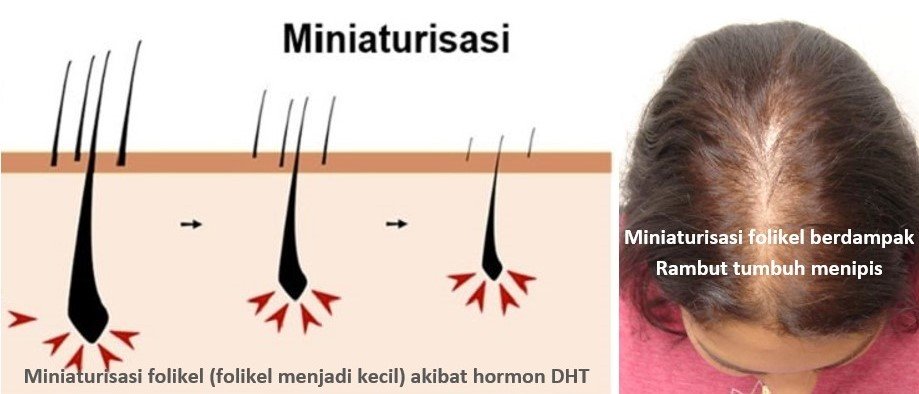 Di bagian dalam kulit kepala Anda, terdapat bulbus/akar rambut, dan folikel, tempat batang rambut tumbuh. Dalam tubuh pria maupun wanita terdapat hormon Testosteron, meski pada wanita jumlahnya sangat sedikit. Faktor stress akan mengubah hormon Testosteron Anda menjadi hormon DHT. DHT merupakan musuh folikel rambut di kepala Anda. DHT dapat mengecilkan folikel rambut di kepala, sehingga rambut sehat tidak mungkin bisa bertahan. Pada wanita, jumlah hormon DHT yang sedikit pun sudah berdampak besar, membuat rambut semakin tumbuh tipis. Akibatnya, hal ini menyebabkan kerontokan rambut.